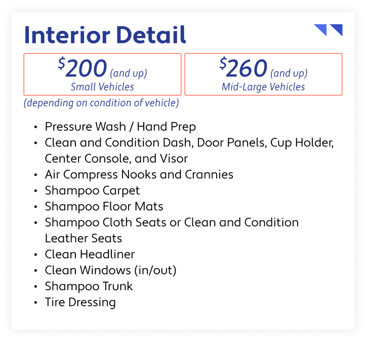 At Novato, it is all about the details. That’s why we have comprehensive detailing packages for your car, to give it a Novato shine, inside and out! Check out our full menu and schedule an appointment below!